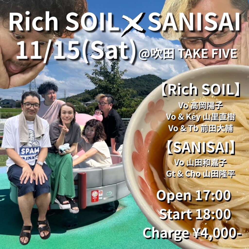 2025年11月15日(土) 大阪・吹田 LiveBar TAKE FIVE 『Rich SOIL × SANISAI』 会場/大阪・吹田 LiveBar TAKE FIVE(大阪府吹田市内本町2-2-5 旭トゥーレB1F)時間/OPEN17:00 START18:00料金/¥4,000 出演/Rich SOIL(高岡陽子、山田直樹、前田大...