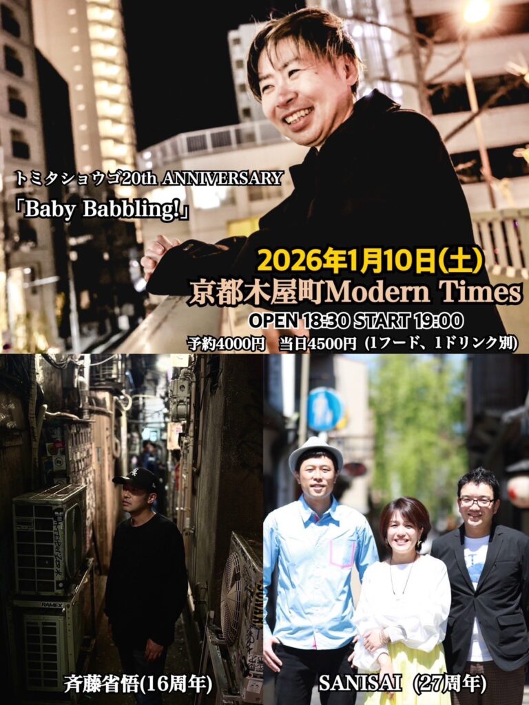 京都・木屋町Moden Times トミタショウゴ20th ANNIVERSARY 『Baby Babbling!』 出演/トミタショウゴ、≪先輩ACT≫SANISAI(27周年)、≪後輩ACT≫斉藤省悟(16周年) 京都在住シンガーソングライター「トミショー」ことトミタショウゴ君の20周年ライブに SAN... -